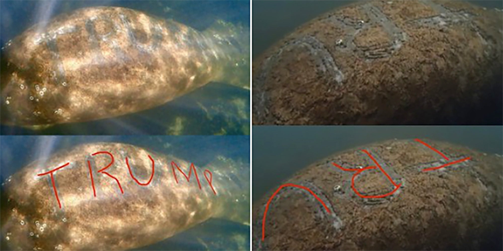 A manatee was found with the word trump scrawled on its back in a florida swimming hole, prompting an investigation from the united states fish and wildlife service, reports said monday. A manatee with the name trump etched into its back was found in florida's homosassa river over the weekend, prompting federal officials to open an investigation into this disturbing disfigurement of a. Manatees are popular attractions in florida but their numbers are at risk.
